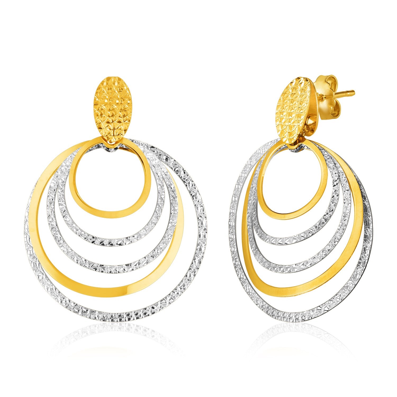 Contrast and intrigue abound in these fascinating 14k yellow and white gold earrings with both textured and polished elements. Post earrings are held in place by pushback clasps.