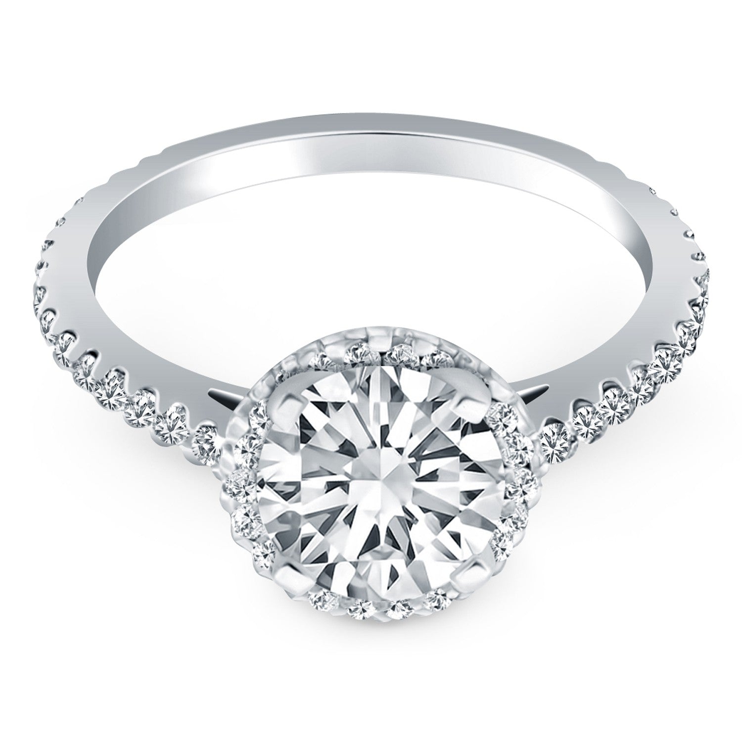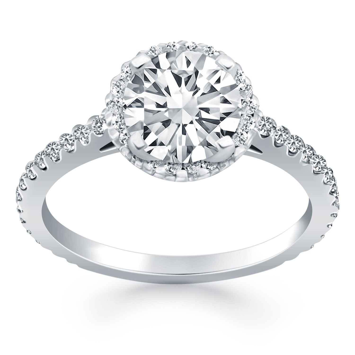 The center setting floats above a diamond encrusted halo in this elegant engagement ring. The cathedral silhouette is accented with diamonds along the band as well as additional diamonds set underneath the center setting. Expertly crafted in 14k white gold, the center setting can be customized to accept a wide range of center stone sizes and shapes. The center stone and setting are not included.