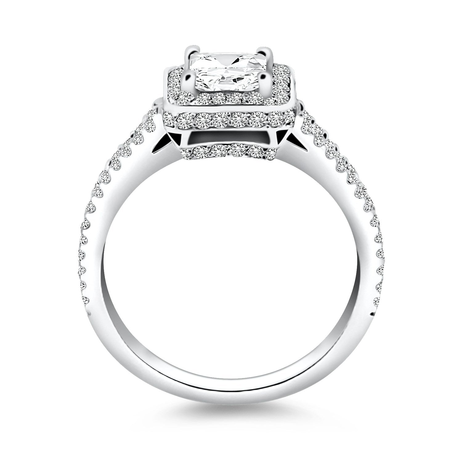 The glittering pave diamond halo in this elegant engagement ring mounting boasts an exciting geometric appeal. The square shape gives a tailored yet vintage feel to the modern split shank design. Expertly crafted in 14k white gold, micro prongs et diamonds enliven the band. Available as a semi-mount to accommodate your precious center stone. Center stone and setting is not included.