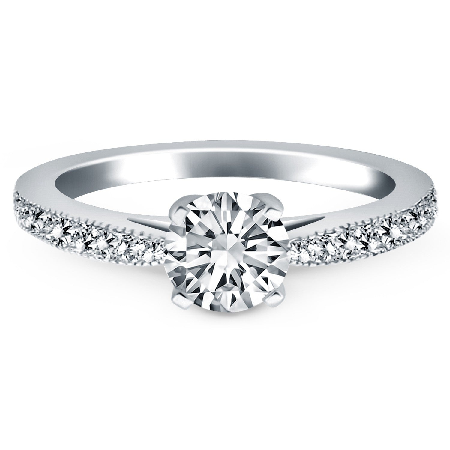 Our classic cathedral engagement ring gets encrusted with glittering pave set diamonds surrounded with milgrain borders in this stunning design. The silhouette has all the features you would come to expect, graceful tapers, milgrain edges, and expertly crafted in 14k white gold. The center setting can accommodate a wide range of center stone sizes and shapes. Center stone and setting not included.