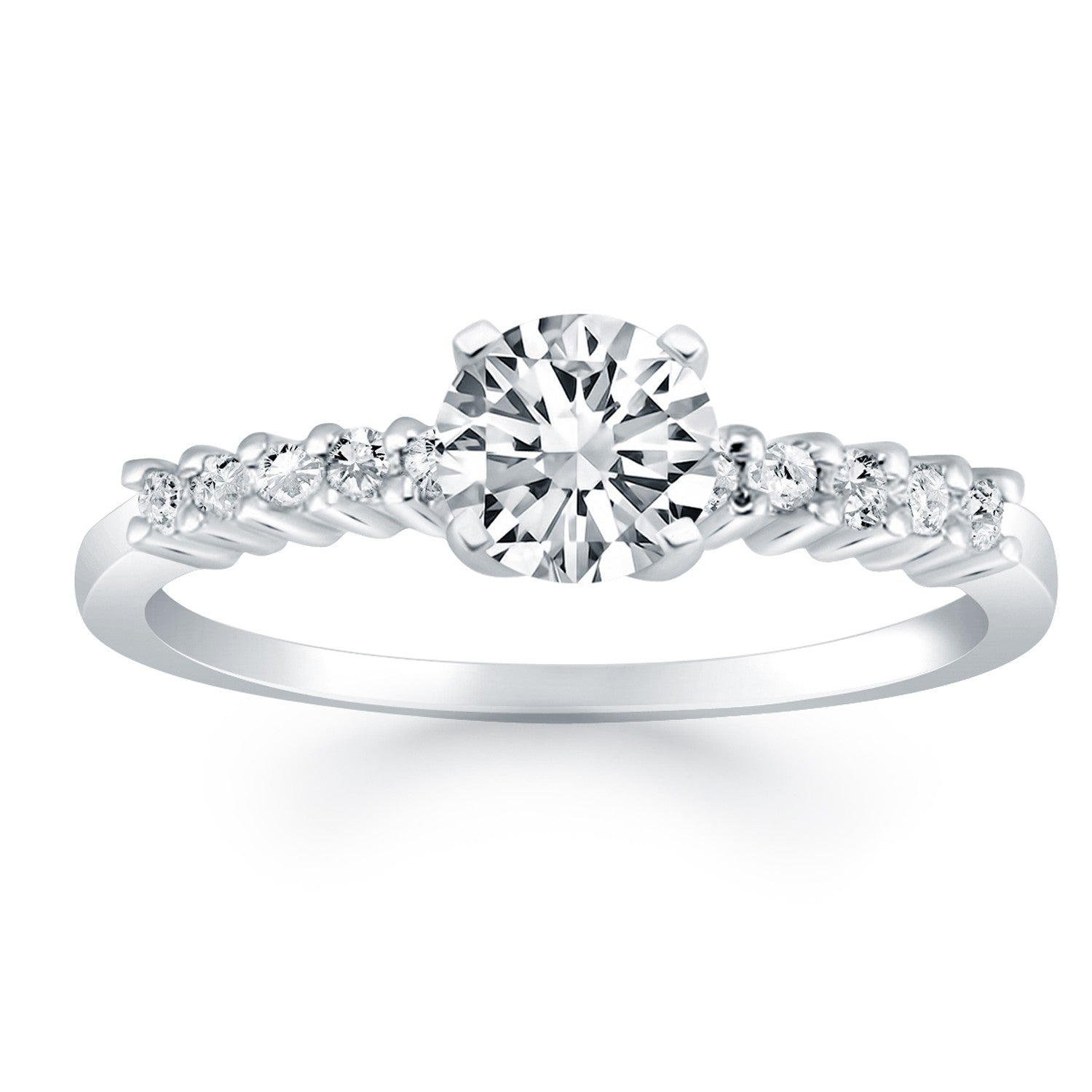 Ten bright diamonds lend a sparkling accent to this elegant engagement ring mounting. The shared prong settings lead the eye to the center setting. Expertly crafted in 14k white gold, the center setting can be customized to accept a wide range of center stone sizes and shapes. The center stone and setting are not included.