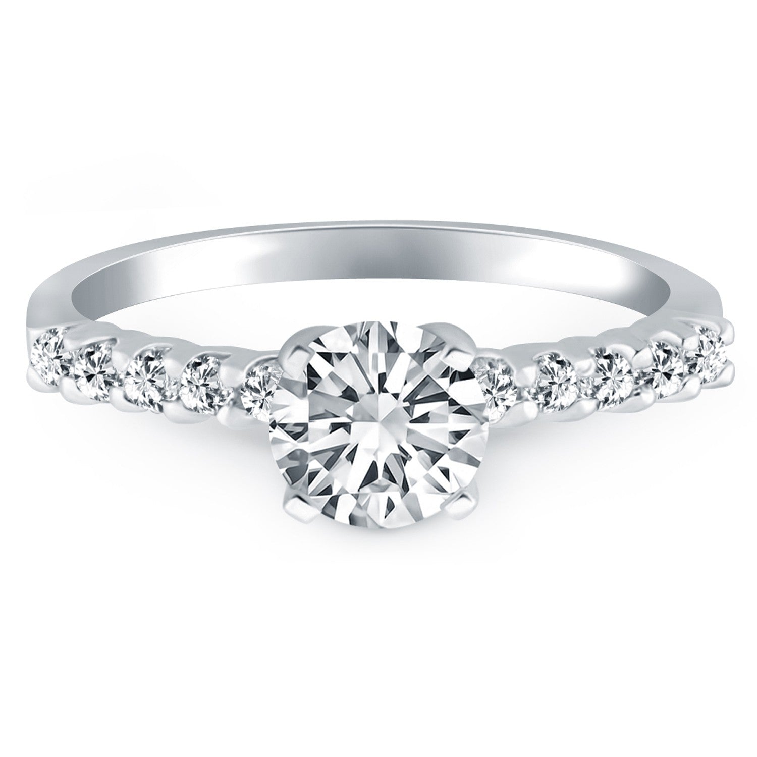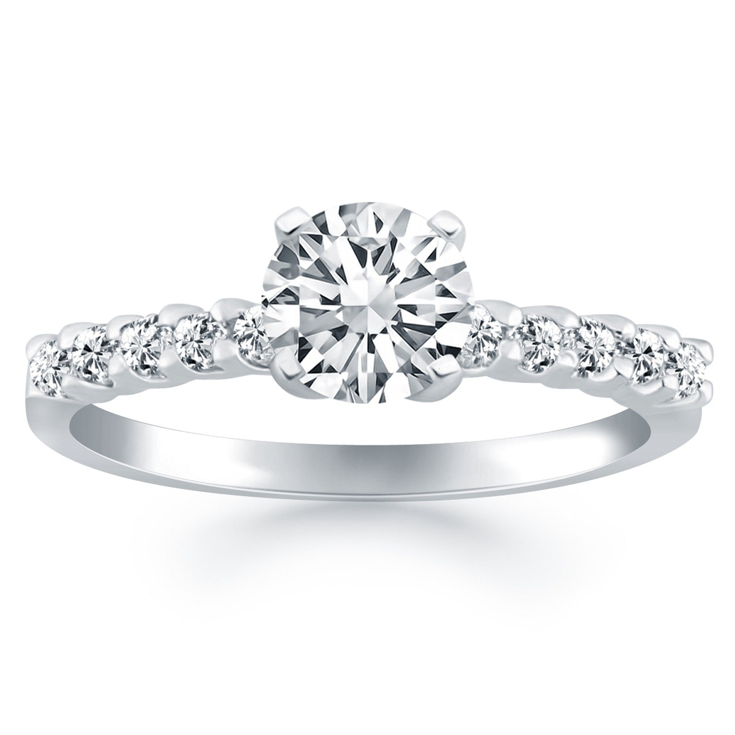 A glittering row of shared prong diamonds enlivens the band of this elegant engagement ring mounting. Able to accommodate a wide variety of center stone shapes and sizes, this ring does not include a center stone or setting.