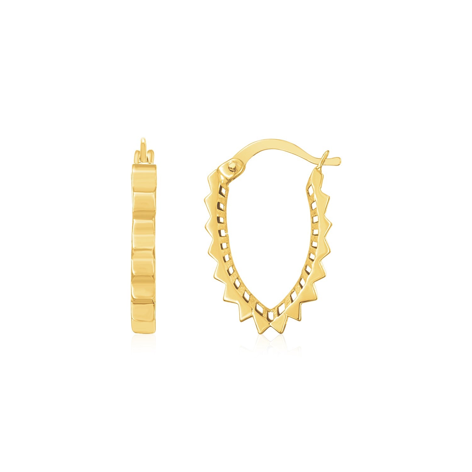 These Spiky V-Hoop earrings are beautiful & unique! Timeless, elegant earrings that will add depth and dimension to your current collection. Great for pairing alongside others or wearing independently. Crafted in 14k yellow gold with a high polish finish & a hinge clasp closure.