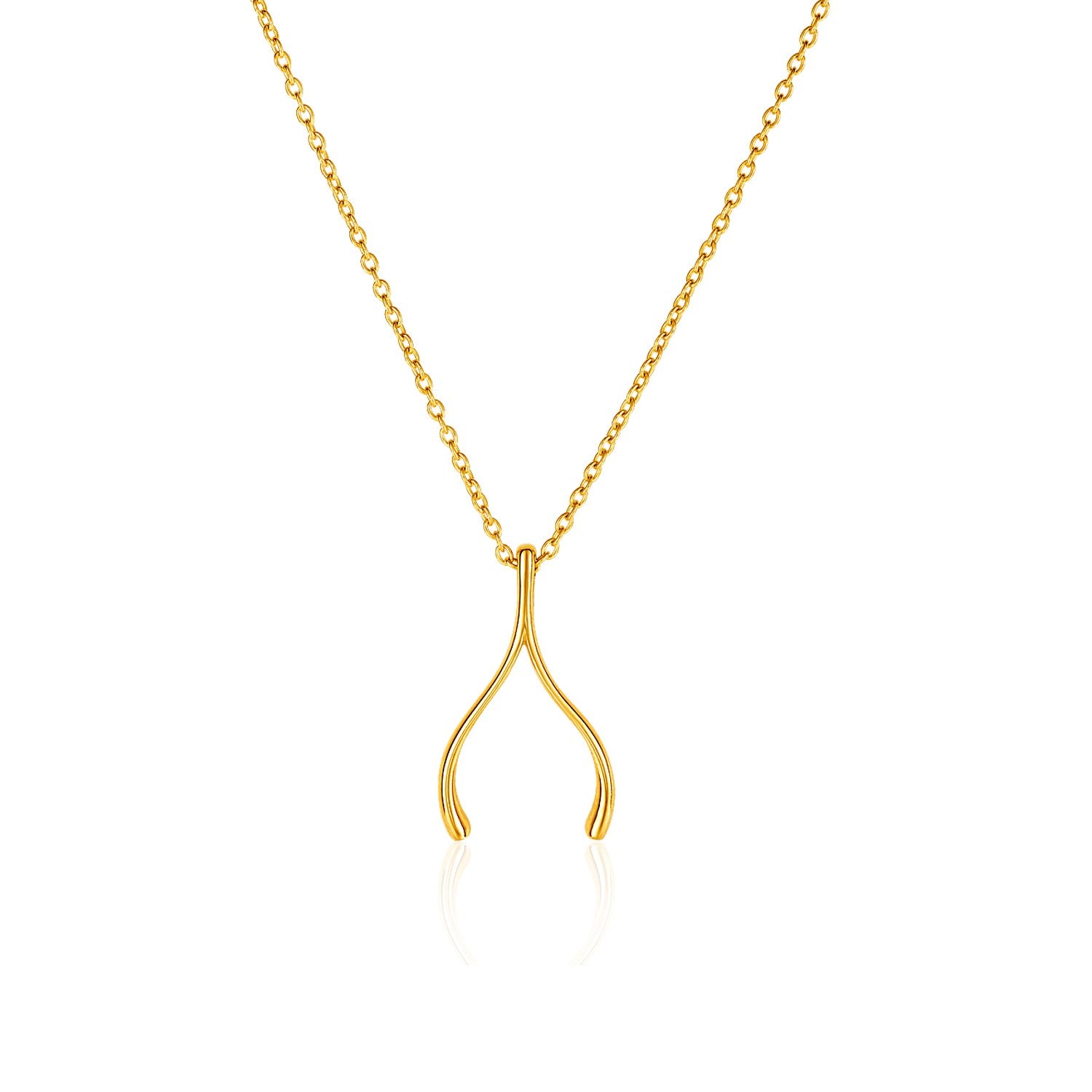 A simple reminder to make a wish every day, this simple gold wishbone adorns a fine gold chain. Pendant measures 20 millimeters by 12 millimeters. Pendant is 17 inches long, 1.1 millimeters wide, and closes with a lobster clasp.